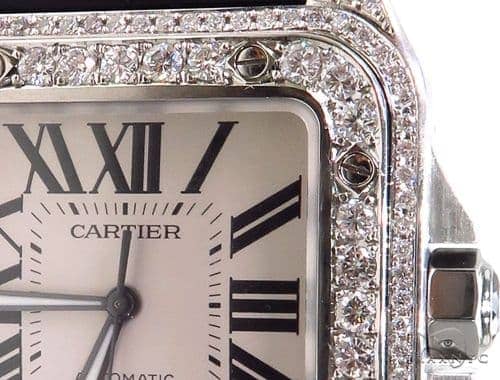 This model comes with two interchangeable bracelets, one full black leather with metal buckle and the second black rubber. Brand cartier model santos de cartier … Cartier santos 100 rose gold 33mm custom diamond watch brown. This model comes with two interchangeable bracelets, one full black leather with metal buckle and the second black rubber. This santos watch ref.wssa0039 has been custom diamond set with black diamonds to the full case and clasp. Cartier santos 100 xl full custom diamonds. Add to shopping bag add to bag. Cartier santos 32mm 15ct vs custom diamond automatic unisex watch. Cartier santos 100 rose gold 33mm custom diamond watch brown.